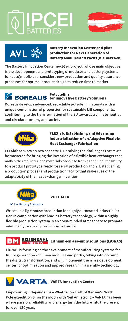 Six companies from Austria participate in the IPCEI EuBatIn: AVL, Borealis, Miba, Miba Battery Systems, Rosendahl Nextrom and Varta Micro Innovation.