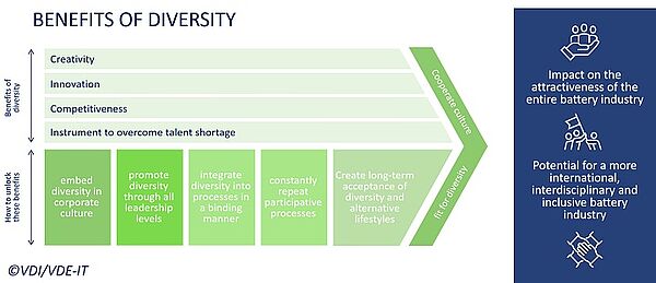 Both the upscaling of battery cell production and the transformation of the automotive industry will be impaired if the demand for skilled workers cannot be met in a timely manner. According to the latest estimates, the number of people available to the labour market in Germany alone could fall by more than seven million by 2035, mainly for demographic reasons. In contrast, according to the latest forecasts, there will be a demand for skilled workers in the European battery ecosystem of up to 464,000 people in the same period. This is shown by analyses of the accompanying research team of the battery cell production programme, which will be published in the first half of 2023. The study focuses on the current state of labour market in the German battery industry, with a specific emphasis on diversity. It shows that a diversity-friendly corporate culture is key to attracting and retaining the experts needed. By understanding the potential benefits of diversity and implementing strategies to promote it, companies can gain a competitive edge in the race for top talent.